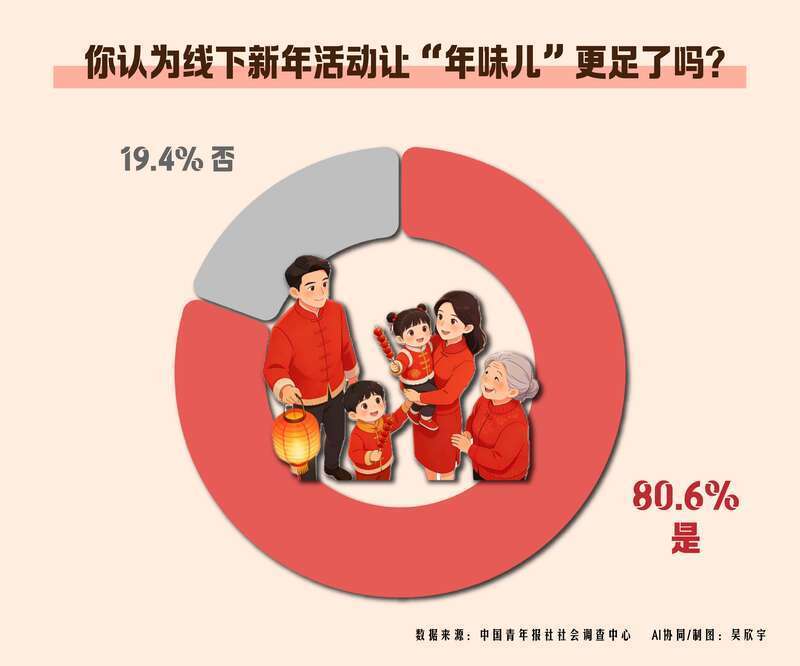 数据显示,80.6%的受访者认为线下新年活动让年味儿更足了。交叉分析发现,受访95后的这一比例最高,为86.3%。在不同所在地的受访者中,县城或城镇受访者的这一比例最高,为85.6%,其次是一线城市(82.5%)、二线城市(81.2%)。